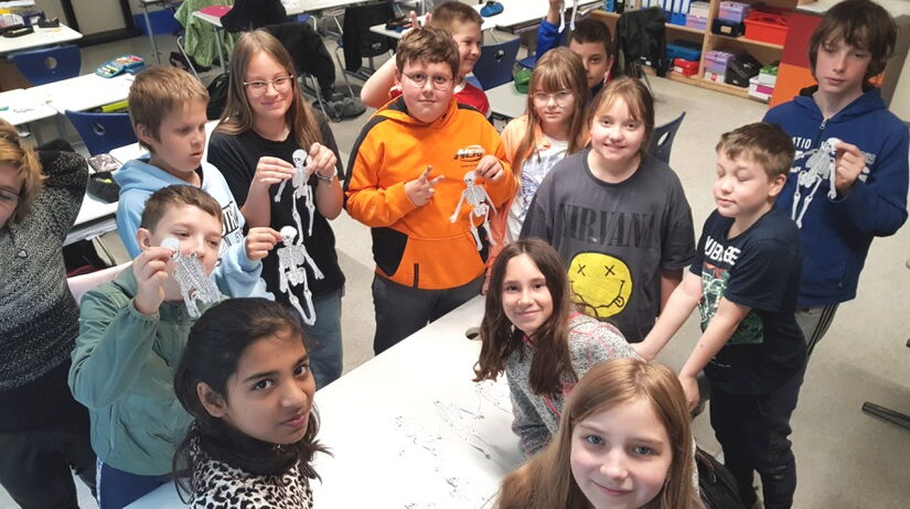 Wo ist das Schlüsselbein? Wo die Speiche? Wie sieht die Wirbelsäule aus? Bei den über 200 Knochen des Skeletts ist die Zuordnung gar nicht so einfach. Die Schülerinnen und Schüler der Klasse 5b kennen sich aber nun gut aus mit unserem Skelett. Theoretisch, am Modell und am Ende noch selbst gebastelt – das Skelett begleitete die Kinder in den letzten NuT-Stunden. Die Zuordnung der verschiedenen Knochen fällt nun wesentlich leichter. Dass man bei den vielen Knochen aber auch einmal durcheinanderkommen kann, ist verständlich ...