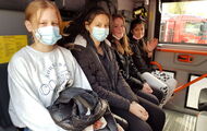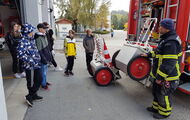 Robert Brandhofer und Bernt Gradwohl führten die Klasse 7b durch die Maschinenhallen und erklärten die Fahrzeuge. Viel Interessantes gab es dabei für die Jugendlichen zu erfahren: dass ein Schutzanzug um die 1500 Euro kostet, wussten die Schülerinnen und Schüler bisher nicht. Auch die Rettungsschere, die z. B. bei schweren Unfällen zum Einsatz kommt, durften die Kinder „bedienen“.