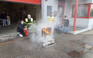 Der Einsatz eines Feuerlöschers sollte ebenso geübt sein: so durfte jede Schülerin und jeder Schüler einen Brand löschen und den ca. 9 kg schweren Feuerlöscher einmal selbst in die Hand nehmen.