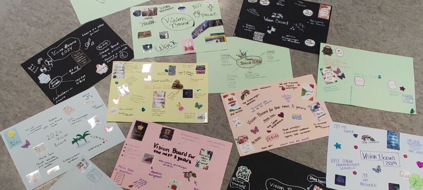 Um motiviert ins neue Jahr zu starten, gestalteten die Schülerinnen und Schüler ihre eigenen Vision Boards. Damit festigt man seine Sehnsüchte, Träume und Wünsche und bringt sie zu Papier.