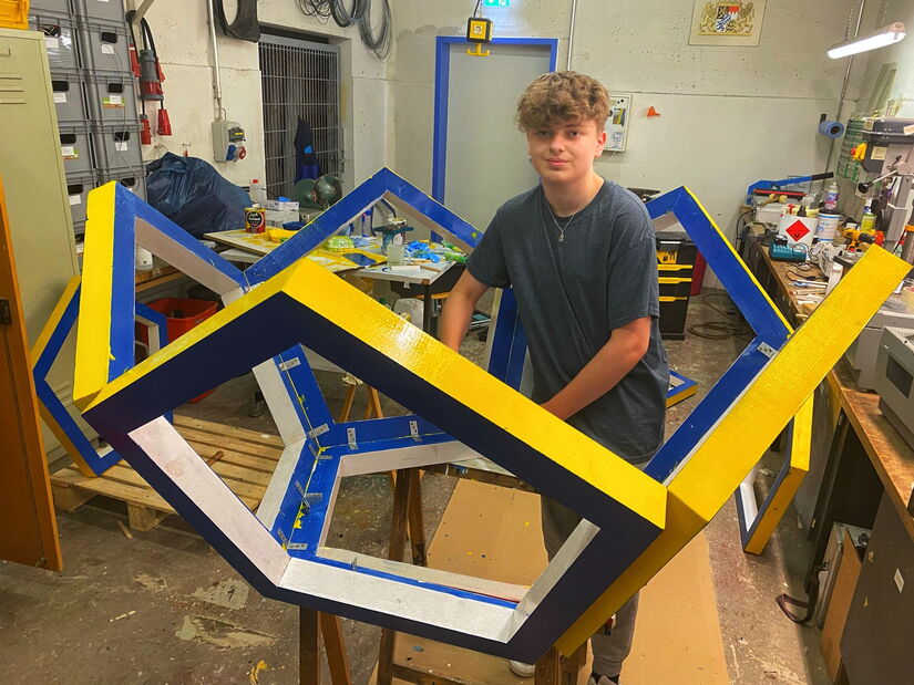 Viel Arbeit haben unsere Schüler um Maxi, die in den letzten Tagen mit der fachkundigen Unterstützung von Herrn Schoreisz den Dodekaeder herstellen. Dieser „platonische Körper“ soll über der Aula thronen – das wird sicherlich ein Eyecatcher für jeden, der unser Schulhaus betritt. Die Fünfecke wurden verleimt, geschliffen und gestrichen und werden jetzt gerade miteinander verschraubt. Das ist gar nicht so einfach, denn immerhin müssen alle Winkel aller Flächen gut passen… Aber wir sind sehr zuversichtlich, dass das imposante Bauwerk noch in der nächsten Woche fertiggestellt werden kann. Wir freuen uns schon drauf!!!