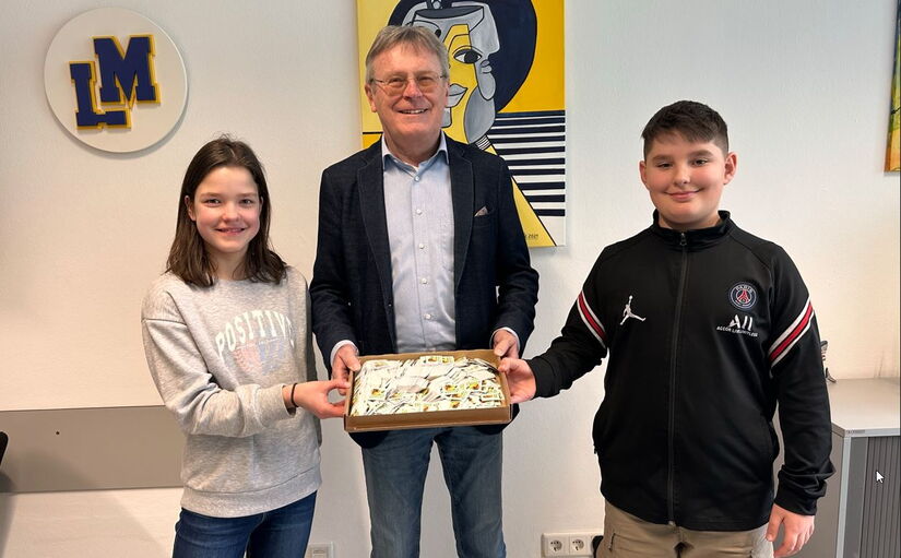 Für jede gesunde Pause - egal ob von zu Hause mitgebracht oder bei uns an der MSL am Kiosk gekauft – gibt´s im Rahmen der Philipp Lahm Schultour einen der stylischen „MSL is(s)t gesund“ Sticker. Es ist uns eine große Freude, dass die ersten 2500 Sticker bereits im Umlauf und fast schon vergriffen sind. Einige Klassen haben ihr erstes Sammelplakat schon voll und sind weiter motiviert dabei, viele weitere in die Klassenwertung zu bringen. Immerhin bekommen die Gewinner einen sportlichen Ausflug mit der ganzen Klasse als Geschenk. Gut also, dass Josef Schätz, der Vorsitzende des Fördervereins, bei seinem heutigen Besuch 2500 weitere Aufkleber als Geschenk dabei hatte.