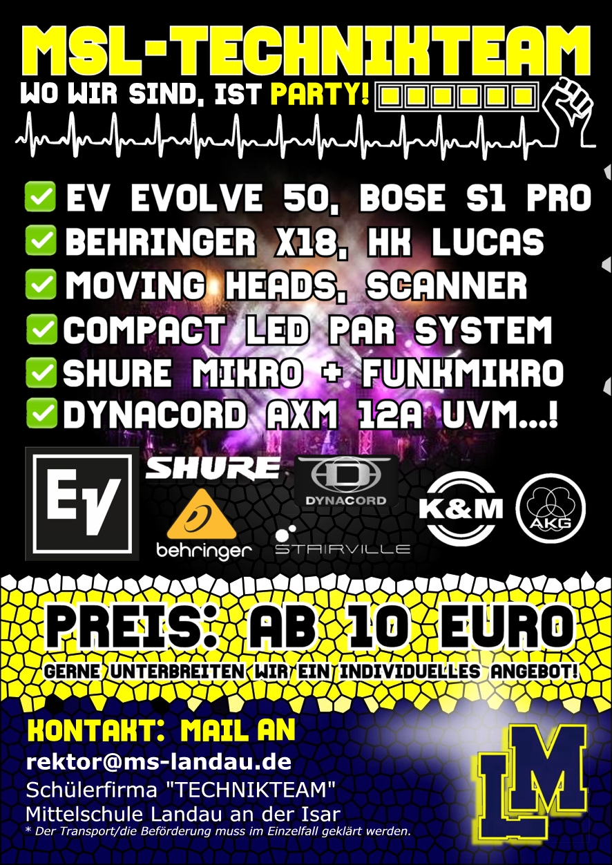 Immer mehr Veranstalter freuen sich über tolles Equipment vom TechnikTeam, wir werden tatsächlich unserem Motto gerecht: Wo wir sind ist Party! … und damit sich das noch mehr rumspricht, haben wir uns neue Flyer drucken lassen. Das macht unter anderem auch deswegen Sinn, weil wir in den letzten Monaten gerade im Bereich Audio hervorragend aufgerüstet haben. Durch die ehemalige Anlage der Stadthalle Landau konnten wir unsere Palette nochmals erweitern.