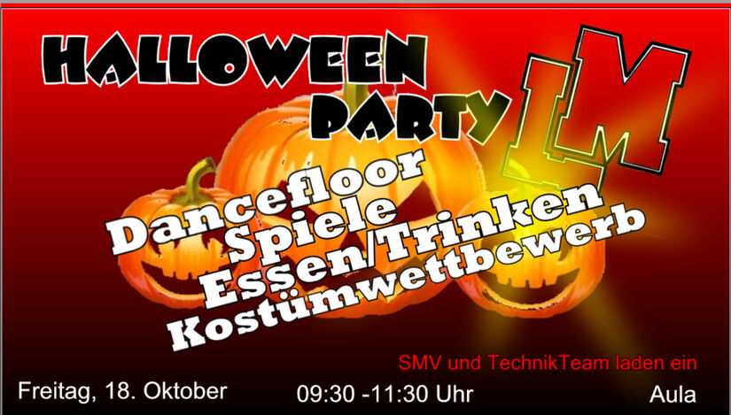 Eines ist sicher:„Party“ können wir! … und deswegen gibt es auch in diesem Jahr wieder die tolle Halloweenpart der SMV und des TechnikTeams, auf die sich viele unserer Kinder und Jugendlichen schon lange freuen. Allerdings sind wir aufgrund des Theaterprojektes diesmal eine Woche früherer dran. Eines aber ist wie immer sicher: Auch am 18. Oktober wird es heiß hergehen bei uns in der Aula! Der Aufbau ist geplant, das Programm steht, die Playlist wird gerade erstellt, die Vorfreude ist groß: Wir sind gerüstet und freuen uns auf deine Kostüme und eine coole Party! Die Umfrage für die Playlist wird in Kürze hier veröffentlich …