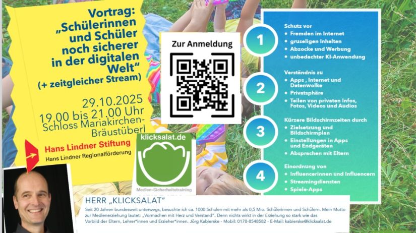 Da das Thema Mediennutzung von Kindern zunehmend Fragen und Probleme aufwirft, möchten wir hierzu Unterstützung anbieten. Am 29. Oktober 2025 lädt die Hans Lindner Stiftung zu einem kostenfreien Hybrid-Vortrag im Schloss Mariakirchen/Zoom ein.