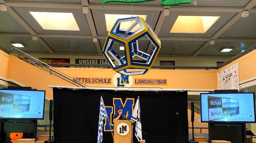 Für jeden Besucher unserer Schule wird er von nun an ein absoluter Hingucker sein: der Mescherjakov – Dodekaeder in unserer Aula. Benannt ist dieser in unseren Schulfarben lackierte Platonische Körper, der sich aus 12 regelmäßigen Fünfecken zusammensetzt, nach dem Schüler, der sich in den letzten Tagen und Wochen in besonderer Weise beim Bau eingebracht und engagiert hat. Vor allem Maxi Mescherjakov hat unter der fachkundigen Anleitung von Herrn FM Michael Schoreisz in unzähligen Arbeitsstunden den Dodekaeder gebaut und lackiert. Danke für deinen großen Einsatz!