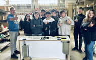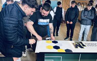 Das gab´s wohl noch nie: die Technikgruppe 8ab besuchte gleich zwei Betriebe an einem Nachmittag. Und das hatte auch seinen ganz besonderen Designhintergrund, denn der Globalplayer und einer der big5 im Bereich der Sporttischkicker („Spielzeug machen wir hier nicht!“) „Leonhart“ aus Harburg sponserte der MSL einen nigelnagelneuen LEO - Turnierkicker, auf dem ansonsten die Profis auf diversen Meisterschaften zaubern. Die angehenden Techniker konnten beim Hersteller vor Ort den gesamten Produktionsweg eines Tischkickers miterleben, wurden dabei von den Brüdern Christian und Andreas Fiedler durch die Werkstätten und Produktionshallen geleitet. Sie wussten sehr viel über die einzelnen Schritte, die Berufe und eingesetzten Maschinen zu erzählen, zogen die Jugendlichen in ihren Bann. Das Highlight aber war sicherlich, als die Schüler den Tisch eigenhändig - selbstverständlich mit professioneller Unterstützung - mit der von der Firma TYPO an der ersten Station des Tages vor den Augen der Kinder gedruckten Folie bekleben durften.