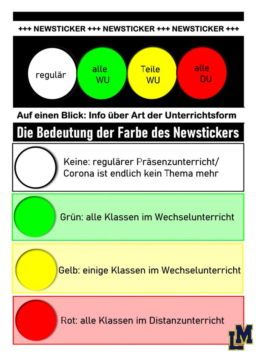 Auf einen Blick erhalten Sie anhand der Farbe des Newstickers Rückmeldung über die aktuell zulässige Unterrichtsform, die an unserer Schule umgesetzt werden kann! Die Art des Unterrichtes wird jeweils durch das Landratsamt für den Landkreis angeordnet. Die Einzelschulen haben darauf keinen Einfluss. Der Newsticker (das durchlaufende Band im oberen Bereich unserer Website) wird auf einem farbigen Hintergrund abgebildet.
