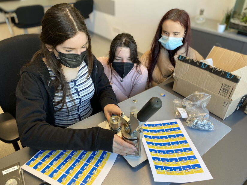 Auch die Klasse M8d beschäftigt sich in diesen Tagen intensiv mit dem Krieg in der Ukraine. Alle sind sich einig: Da müssen wir irgendwie helfen. Lena, Kathi und Lea hatten die Idee, Buttons mit dem Aufdruck „NO WAR“ herzustellen. Diese sollen dann in der Pause für 1€ verkauft werden. Der Erlös geht in die Ukraine.