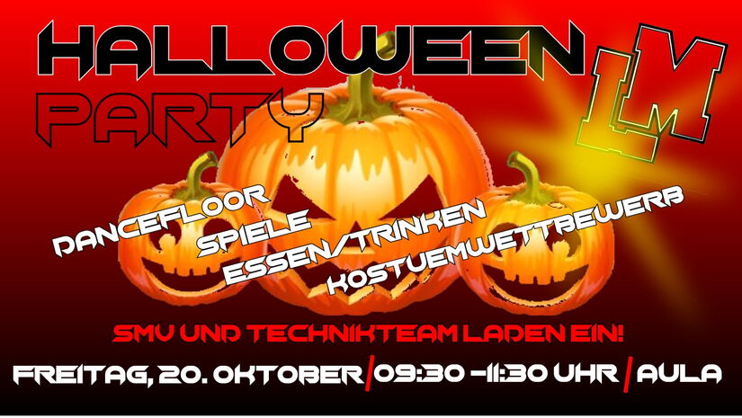 Nina, Joni und Lennox vor der SMV, Tibi (COS des TechnikTeams), Betreuungslehrer Michael Grubmüller und Rektor Christian Ehrenreich trafen sich zu einer Planungssitzung für die große Halloween Party, die am Freitag, den 20.10. bei uns in der Aula stattfinden wird.