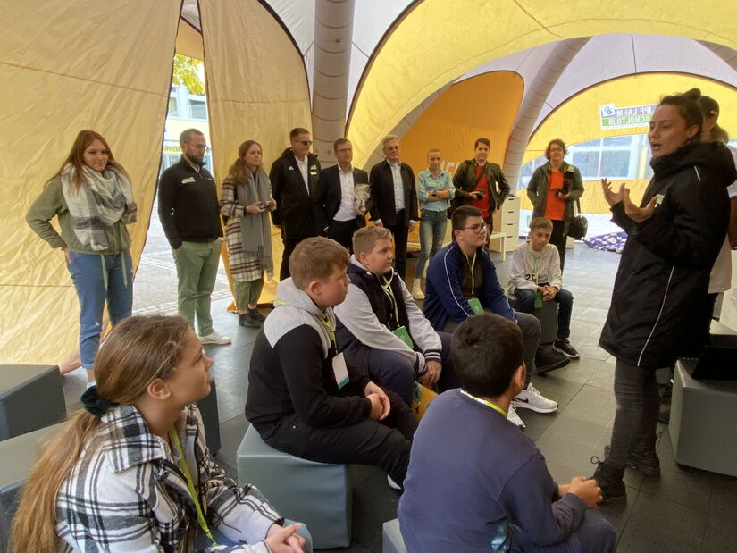 Pressetermin bei der Philipp Lahm Schultour: Kooperationspartner AOK und Förderer beeindruckt