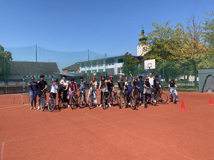 Die Schülerinnen und Schüler der Mittelschule Landau bedankt sich bei Julia Überreiter und Anton Huber vom Kinderschutzbund Landau an der Isar. Im Rahmen des Projektes „Bewegungsfreude“ gelang es den beiden durch ihr großes Engagement 9 vollausgestattete und verkehrstüchtige Fahrräder zu organisieren, welche dann als Geschenk an die Schüler*innen der Willkommens-, und Deutschklasse gingen, die selbst noch kein eigenes Rad besaßen. Anschließend konnten die Fahrräder bei schönem Wetter in einem kleinen Hindernissparcour ausgetestet werden.