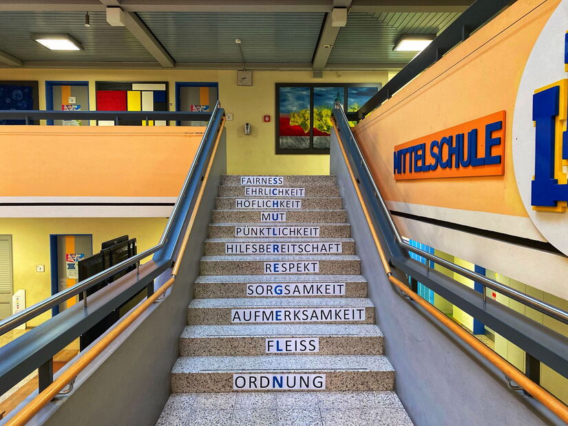 Die im letzten Jahr von der Gruppe Wirtschaft 10 von Frau März hergestellten Schulregeln, die auf unserer Haupttreppe angebracht sind, waren doch schon ein wenig „mitgenommen“… . War das eventuell der Grund dafür, dass sich einige wenige Schüler etwas schwer taten, sie tatsächlich umzusetzen?? Da haben wir jetzt aber wieder optimale Voraussetzungen geschaffen, denn die „Stufen zum Erfolg“ wurden neu erstellt und aufgeklebt