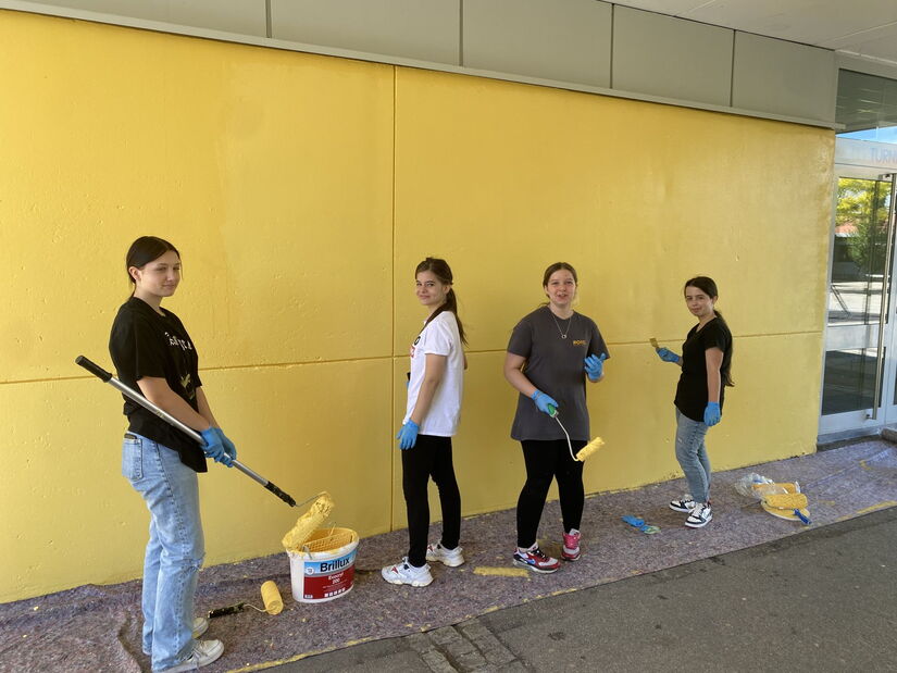 Startschuss für´s Graffitiprojekt: Wand erstrahlt in leuchtendem Mittelschulgelb …