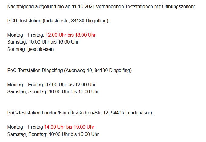 Die veränderten Öffnungszeiten der PoC - Teststation in Landau an der Isar: