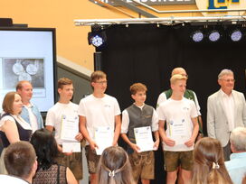 Jonas Holzleitner, Andreas Blank, Alexander Kreiner, Lukas Klostereit haben sich mit großem Engagement über einen langen Zeitraum für die Schülerfirma „Lasern und da Druck“ mit Unterstützung von Christina Gerstl und Werner Gerl verdient gemacht. Mit sehr großem zeitlichem Aufwand, oftmals nach der Schule und sogar während der Ferien wurden die 3d – Drucker, Laser und Graviergeräte zusammengebaut, der Umgang mit der Software erlernt und erprobt, diverse Grafiken und Schriftzüge entworfen und auf unterschiedliche Träger gelasert.