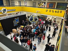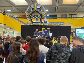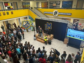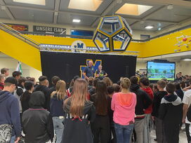 Deswegen war die Stimmung heute schon ein wenig traurig, als Herr Ehrenreich Frau Plötz in der voll besetzten Aula verabschiedete. So manch einer vergoss auch ein Tränchen, als Johanna das Mikrofon übernahm und wirklich rührende Worte an uns richtete. „Ich war immer so gerne bei euch, hier an der MS Landau! Ich werde euch nie vergessen!“ Damit sie uns ganz sicher in Erinnerung behalten wird, übergab Rektor Ehrenreich einen - natürlich vegetarischen - Geschenkkorb mit allerlei Leckereien und vor allem ein Plakat, auf dem jeder einzelne Lehrer oder Schüler unterschrieben hatte. Man kann sich vorstellen, dass beim Abschlusslied jede/r in der Aula, ganz egal ob groß oder klein, lauthals mitsang: „Ein Hoch auf dich, auf dieses Leben, auf den Moment, der immer bleibt! Ein Hoch auf dich, auf jetzt und ewig, auf einen Tag Unendlichkeit!!“ … wie passend!