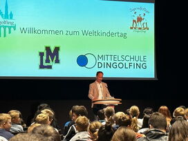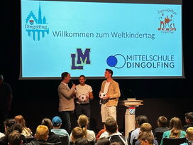 Schnell hatte er die mehr als 350 Kinder aus den 5. und 6. Klassen der Mittelschulen Dingolfing und Landau in seinen Bann gezogen, denn Jimmy Hartwig erzählte von seinem Leben. Und das ungemein spannend und mitreißend. (Lieder) kein Wunder, denn der ehemalige Bundesligafußballprofi und Nationalspieler hatte es nicht immer leicht in seiner Kindheit, wuchs er doch als Sohn eines amerikanischen Soldaten mit seiner Mutter beim Großvater in Offenbach auf. Vor dessen Schlägen flüchtete er nach draußen zum Fußballspielen, widerstand all den Anfeindungen, die er als „Schwarzer Jimmy“ auch dort erleiden musste. Seine Botschaft an die Jugendlichen: Ihr seid stark, habt alle Chancen. Geht euren Weg, fair und anständig, strengt euch an, zeigt Respekt, schämt euch für nichts und niemanden – und wusste hier auch mit Vergleichen zu den Weltfußballern Ronaldo oder Messi zu überzeugen. Denn auch „sie sind durch harte Arbeit, durch viel Fleiß und Training zu Weltstars geworden“. „Das könnt ihr alle auch!“, ist sich Jimmy - so möchte er von den Kindern genannt werden - sicher! Viel Spaß hatten die Kinder auch noch bei den anschließenden Stationen, an denen sie etwa ihr Talent beim Torwandschießen unter Beweis stellen, das Geburtsland auf einer Weltmarke markieren oder Straßenbilder zum Thema Kinderrechte malen durfte.