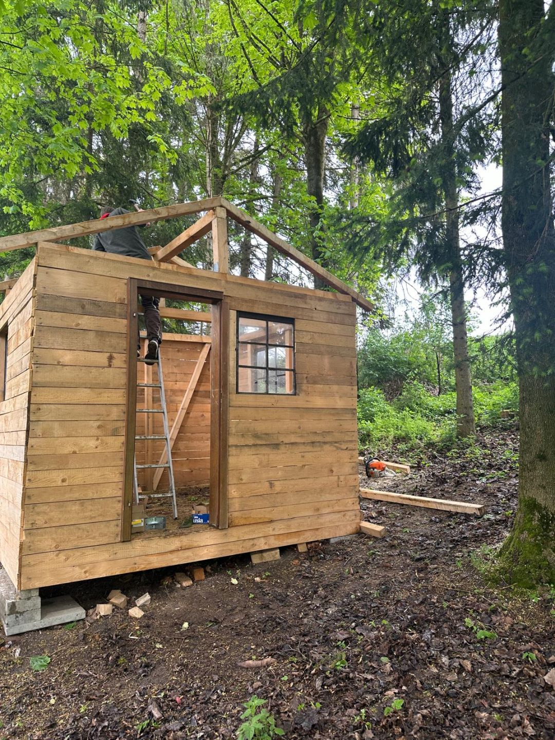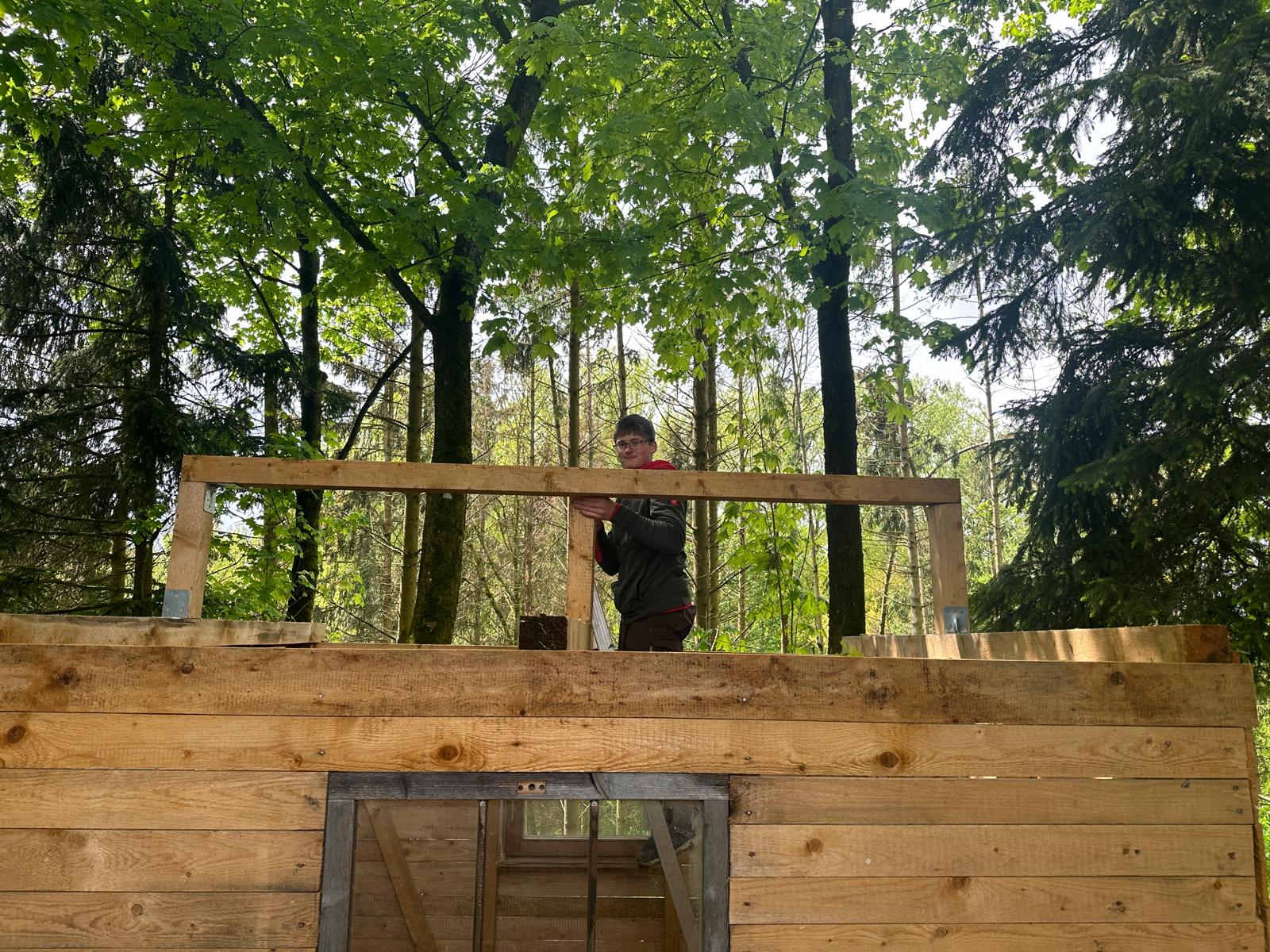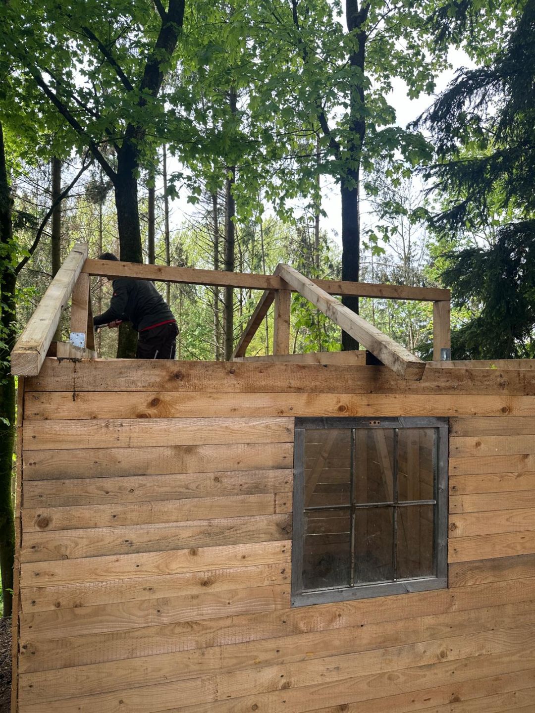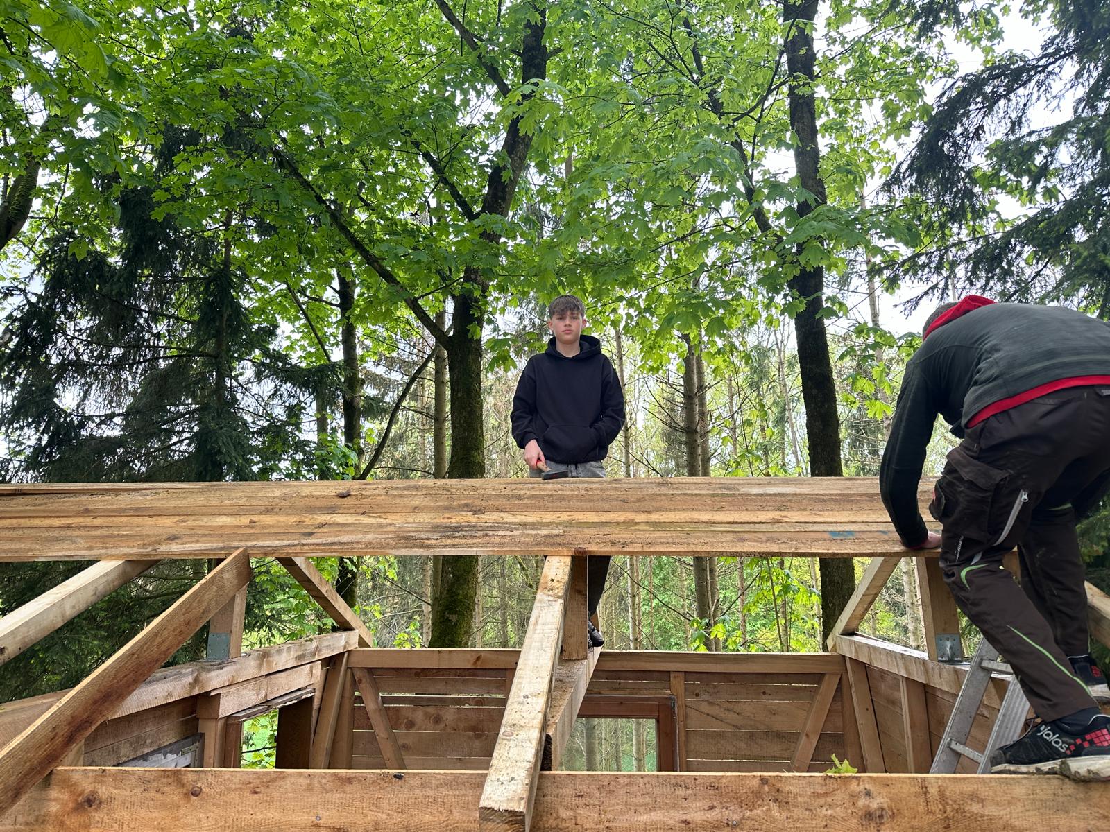 Ein bisserl frisch war es zwar heute anfangs schon, aber da wir viel zu tun hatten und alle fleißig arbeiteten, wurde uns schnell mollig warm. Einzelne sah man sogar schwitzen, denn das Dach für unsere Edelhütte stand auf dem aktuellen Stundenplan. Nach kurzer Diskussion hatten wir uns auf ein Satteldach geeinigt, zauberten gemeinsam die Dachkonstruktion mit echt schwerer Firstpfette sowie stabiler Sparren. Auf diese nagelten wir unsere Dachbretter - selbstverständlich mit gehörigem Dachüberstand. Mit dem heutigen Tagewerk können wir voll zufrieden sein!