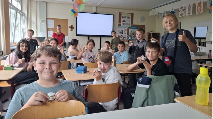 Am zweiten Tag der Projektwoche war eine Kräuterpädagogin zu Besuch bei der 5a. Nach einem theoretischen Teil zu Beginn, durften die Schülerinnen und Schüler gemeinsam eine entzündungshemmende Salbe vom Spitzwegerich herstellen. Anschließend wurde der Kräutergarten über der Tiefgarage besucht. Hier staunten die Schüler nicht schlecht über die Artenvielfalt in den Hochbeeten. Viele waren ganz verwundert über die vielfältigen Einsatzzwecke der verschiedenen Kräuter. Zum Schluss des Vormittags durfte noch selbstgemachter Holundersirup probiert werden. (... Alltagskompetenzen)