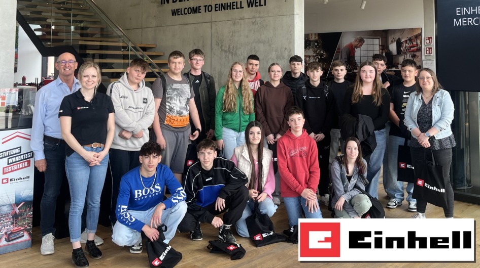 Nach einer Begrüßung durch Fabienne Karl, die den interessierten Jugendlichen auch einen kurzen Überblick über die Geschichte, den Betrieb, die Produkte und die Produktentwicklung der Firma Einhell gab, ging´s gleich auf das Werksgelände. Bei der beeindruckenden Führung durch den Betriebsrat Maximilian Fritz konnte man sich einen Eindruck über den Entwicklungsbereich, die Lagerhallen, den Anlieferungsbereich, das moderne und riesige Hochregallager, die Retourenannahme, den Reparaturbereich für defekte Geräte, das Ersatzteillager und den Servicebereich (Kundenbetreuung) machen. Abschließend staunten die SchülerInnen der Vorabgangsklassen im Showroom über die umfangreiche Produktpalette des weltweit agierenden Landauer Konzerns. „Toll, das ist wirklich super!“, äußerte sich da einer der Schüler, der spontan so richtig Lust auf eine Ausbildung bei Einhell bekam. Mit einer Information über eine ganze Reihe möglicher Ausbildungsberufe und auch Ferienjobs durch Fabienne Karl sowie einem gemeinsamen Abschlussfoto endete der spannende und lehrreiche Nachmittag.