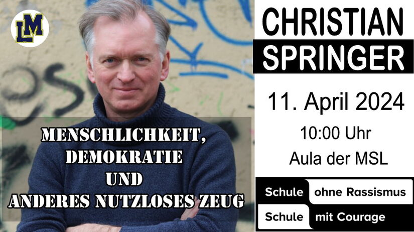 Wir dürfen den bekannten Kabarettist Christian Springer am Donnerstag, den 11.04.2024 bei uns an der MS Landau begrüßen. Veranstalter Roman Hofbauer hatte auf Bitte der Steuergruppe SOR/SMC den Kontakt hergestellt und Christian Springer war sofort bereit, bei uns in der Aula für alle Kinder und Jugendlichen der Klassen 7 – 10 sowie alle drei Deutschklassen aufzutreten. Wir sind Schule ohne Rassismus/Schule mit Courage und freuen uns auf dieses besondere Gastgastspiel zum Thema Integration/Migration, bei dem Herr Springer auch sehr viel von seinen Erfahrungen mit seinem Verein „Orienthelfer e.V.“ in Syrien und Libanon berichten wird. Passt hervorragend zu uns, denn bei uns werden schon seit vielen Jahren Schüler aus diesen Ländern in den Deutschklassen beschult. Die meisten von ihnen haben über die Jahre schon den Sprung in Regelklassen geschafft, viele einen schulischen Abschluss an der MSL gemacht und sich mittlerweile in Ausbildung und Beruf etabliert. Wir freuen uns auf den sicherlich für alle sehr interessanten Vormittag, bei dessen Realisierung unser Förderverein wiederum finanziell unterstützte.
