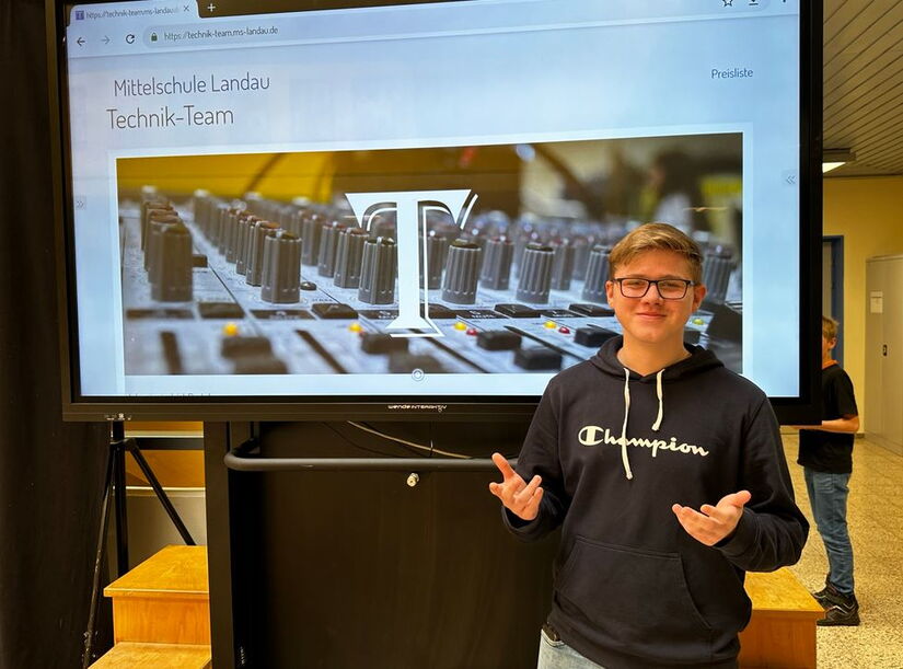 Heute präsentierte Julian Latschuk, seines Zeichens amtierender „COL“ – chief of lights – des Technikteams der MS Landau die von ihm neue erstellte Website in der Aula. Viel Arbeit hat er sich gemacht, um die vielfältigen Produkte, die vom Technikteam bedient werden und selbstverständlich auch im Verlieh sind, zu präsentieren. Frei nach dem Motto der AG „Wo wir sind ist Party!“ können nun unsere Kunden sofort ersehen, welche Produkte in unserem Sortiment sind und wieviel das Ausleihen kostet. http://technik-team.ms-landau.de bietet sogar einen „Einkaufskorb“, in den man seine gewählten auserwählten Artikel ablegen kann und in dem automatisch die Gesamtsumme angezeigt wurde. Logisch, dass auch allgemeine Infos über das Technikteam nicht fehlen. „Dem Technikteam der MSL steht mittlerweile ein achtbarer Fundus an Verstärkern und PA Anlagen sowie sehr eindrucksvoller Lichttechnik zur Verfügung. Die Jugendlichen agieren überaus motiviert, selbstständig und verantwortungsbewusst im Technikteam und haben sich bereits weitestgehend die notwendigen Kompetenzen erworben, um die Anlagen auf- und abzubauen bzw. zu betreiben“, heißt es da etwa. Markus Schnagl von der Firma m-studio, der unsere Schulwebsite hosted, zeigt sich mit Rektor Christian Ehrenreich sehr beeindruckt: „Toll gemacht, lieber Julian!“