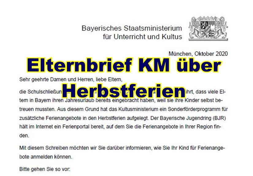 die Schulschließungen im Zusammenhang mit COVID-19 haben dazu geführt, dass viele El-tern in Bayern ihren Jahresurlaub bereits eingebracht haben, weil sie ihre Kinder selbst be-treuen mussten. Aus diesem Grund hat das Kultusministerium ein Sonderförderprogramm für zusätzliche Ferienangebote in den Herbstferien aufgelegt. Der Bayerische Jugendring (BJR) hält im Internet ein Ferienportal bereit, auf dem Sie die Ferienangebote in Ihrer Region finden. .....