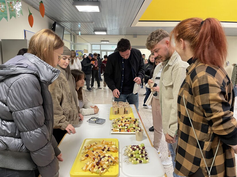 Zur Woche der Gesundheit und Nachhaltigkeit verkaufte die Klasse M 10b letzten Dienstag tolle Obstspieße. Richtig crunchy waren auch die leckeren Obstbecher (natürlich aus Pappe) mit knackigen Nüssen. Es wurden nur regionale und saisonale Obstsorten verwendet. Bei den Schülern und Lehrern kam‘s gut an.
