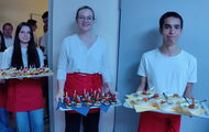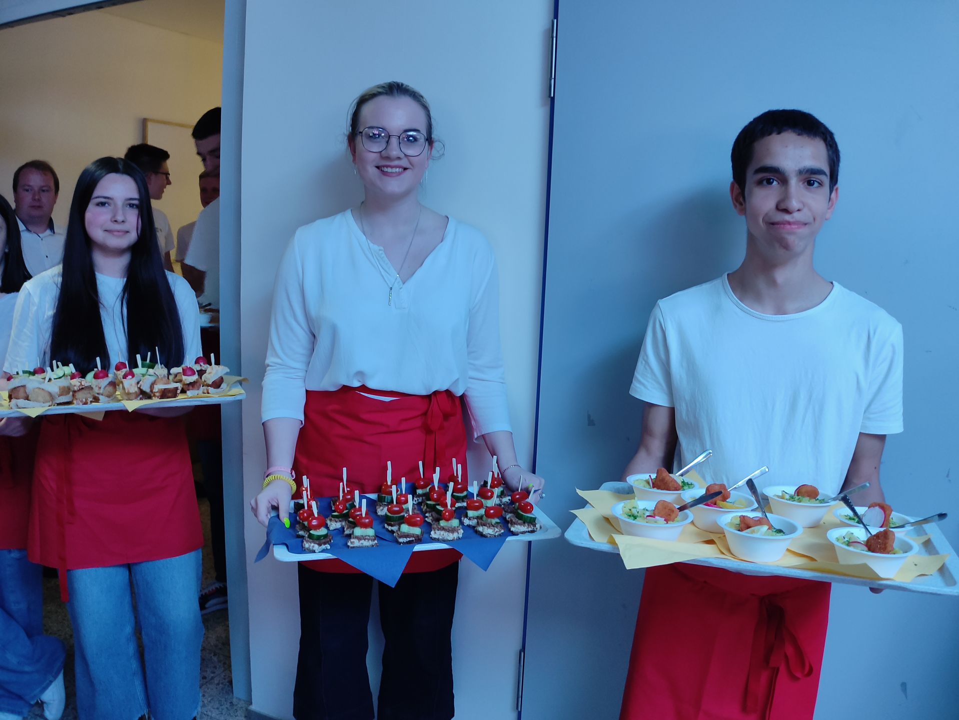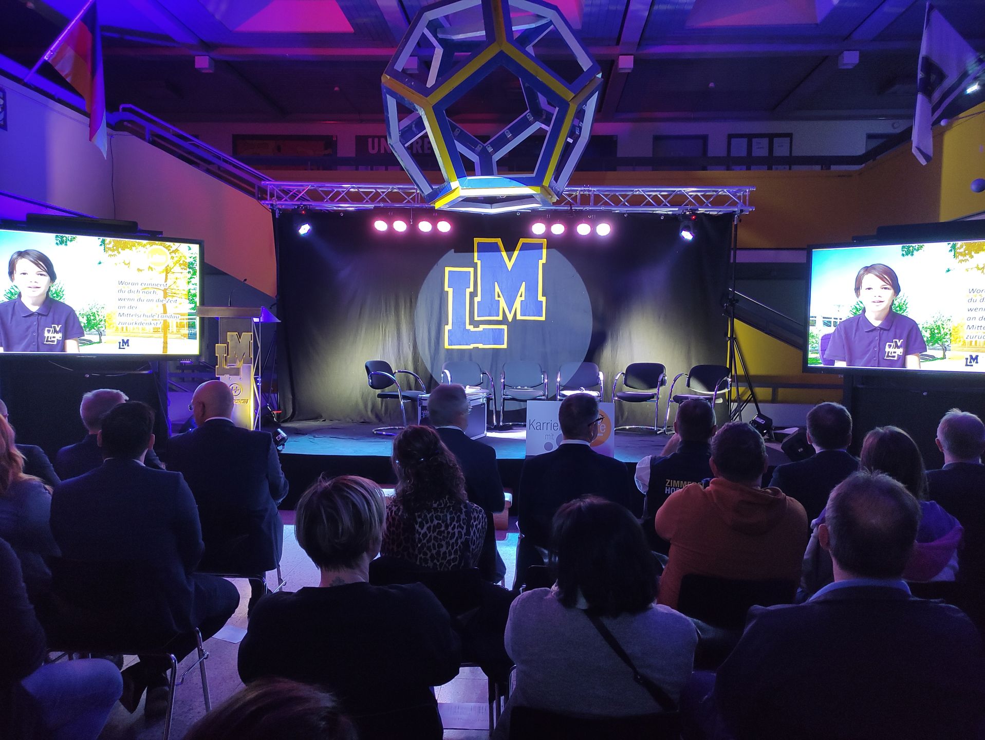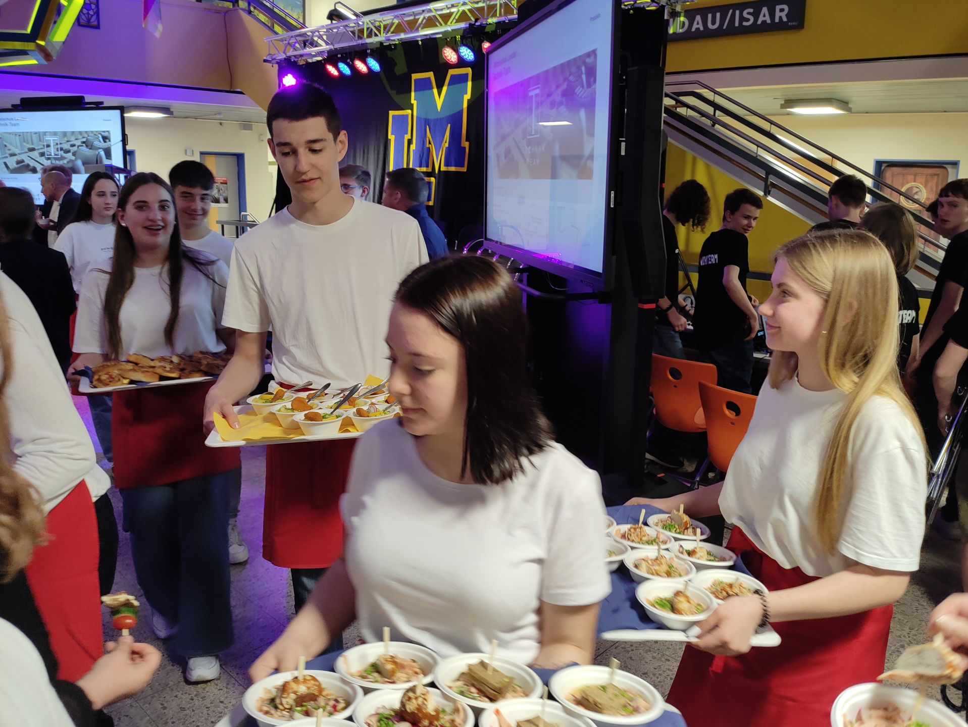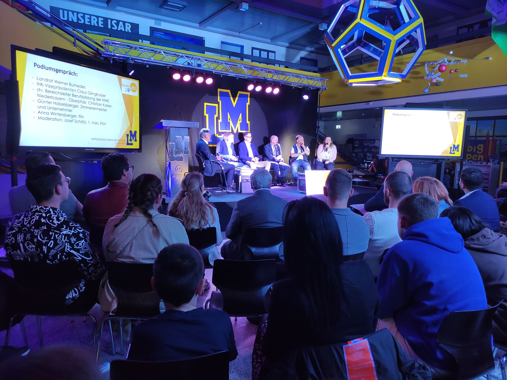 aufzuzeigen, um damit die wichtige Bedeutung der Mittelschule für die Wirtschaft zu unterstreichen. Die hochkarätige Besucherschar unterstrich die Bedeutsamkeit dieser Aktion. Rektor Ehrenreich konnte etwa den Landrat des Landkreises Dingolfing - Landau Werner Bumeder, IHK-Vizepräsidenten Claus Girnghuber, den stv. Bereichsleiter Berufsbildung der HWK Niederbayern - Oberpfalz Christian Kaiser, Günter Hobelsberger, unseren Bürgermeister Xaver Hagn, Schulamtsdirektor Stefan Pielmeier, den Projektgründer Rektor Markus Steinhuber sowie natürlich alle Teilnehmer des Projektes „Karriere mit Lehre“ und somit ehemalige Absolventen der MS Landau begrüßen. Auch alle 6 Schülerfirmen nutzen die Gelegenheit, sich und ihr tolles Angebot der Öffentlichkeit zu präsentieren und überzeugten damit auch den anwesenden Elternbeirat, den Förderverein und die vielen anwesenden Schüler. Ebenso wurden die Schulsanitäter erstmals der Öffentlichkeit vorgestellt. Das Technikteam sorgte mit einer Vielzahl von Lichtern, Scannern und MovingHeads für professionelles Ambiente und die vielen Besucher konnten sich zum Abschluss über ein Running Buffet der Deutschklasse freuen, dass nicht nur optisch, sondern vor allem auch geschmacklich überzeugen konnte. Mit zwei Podiumsgesprächen, der gekonnten Gesangseinlage von Emanuelle und Agnesa, einer Vielzahl von Infos und vor allem den produzierten Clips war der Abend nicht nur sehr interessant, sondern auch äußerst kurzweilig und abwechslungsreich. Alle Gäste waren voll des Lobes … das freut uns natürlich ungemein.