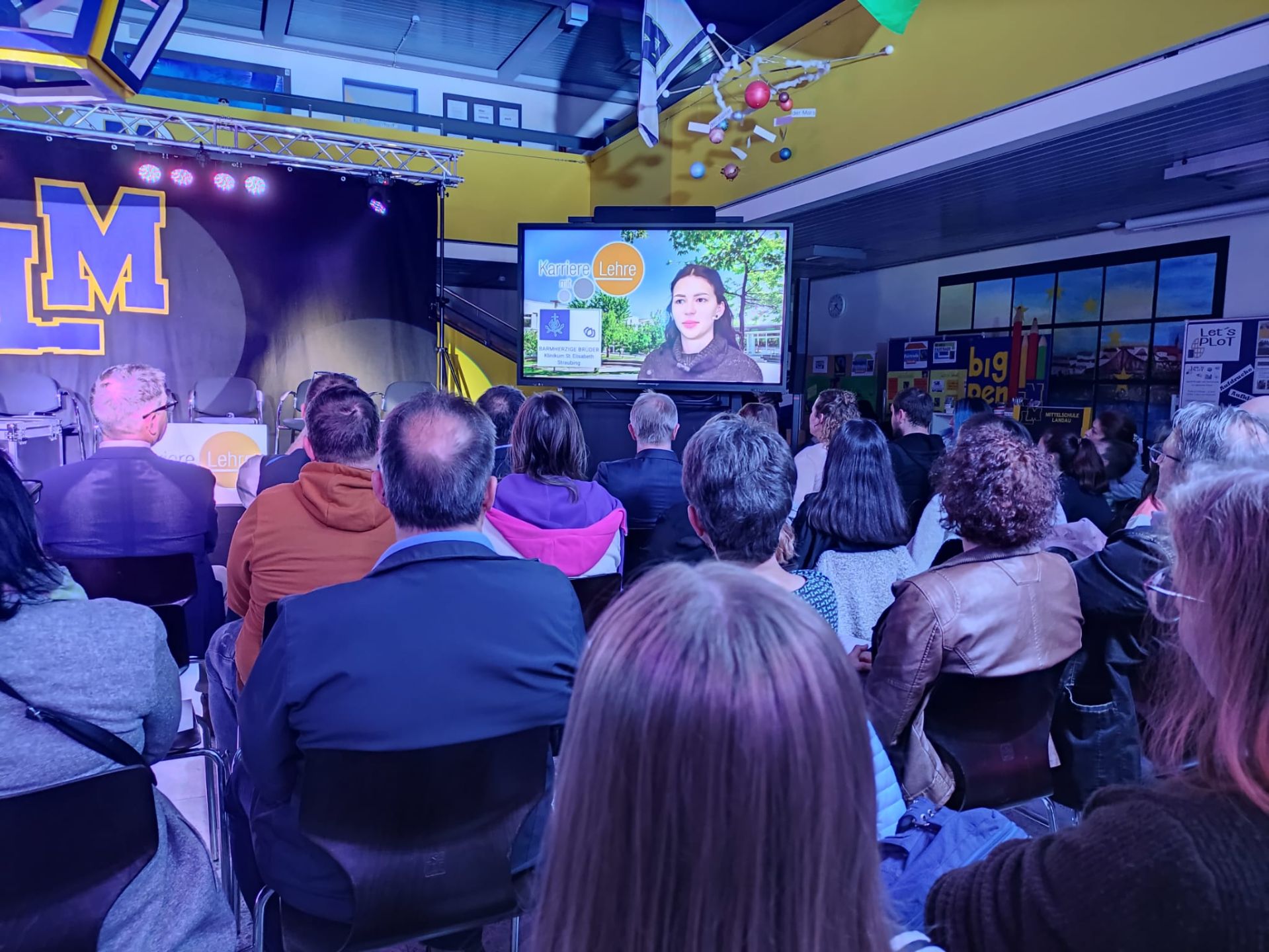 Gestern Abend fand bei uns in der Aula die große Präsentation unseres Projekts „Karriere mit Lehre“ in der Aula statt. Mit „Karriere mit Lehre“ können wir aufzeigen, dass nach dem Besuch einer Mittelschule, also mit dem Quali oder MSA, alle beruflichen Türen offenstehen. Wir bewiesen so, dass man als Mittelschulabsolvent beste Chancen auf dem Ausbildungsmarkt hat, man sich im Berufs – und Erwerbsleben sehr gut positionieren und „Karriere“ machen kann. Es erschien uns wichtig, diese überaus positiven Möglichkeiten