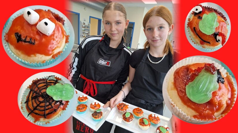 Die Gruppe Soziales 8ab hatte sich für die letzten Stunden in der Schulküche etwas ganz Besonders ausgedacht: Passend zu Halloween wurden neben Kartoffelrahmsuppe mit Blätterteighäppchen sowie Sauerkirsch-Quarkspeisen natürlich auch Halloween „Blutmuffins“ mit Himbeermarmelade zubereitet, die die Mädels mit viel Liebe gruslig verziert haben. Da kann man wirklich behaupten: "Wir essen die Augen mit!" ;-)