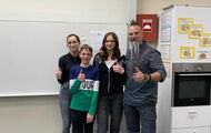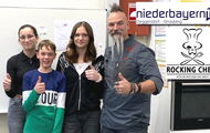 Tom Geiger, Karolina Gurchenko und Sophia Hemauer aus einer unserer SE – Gruppen der 8. Jahrgangsstufe absolvierten gestern einen ganz speziellen Kocheinsatz. Tatkräftig unterstützten sie Starkoch Ralf Jakumeit von den Rocking Chefs bei der Aufzeichnung seines TV – Formats „De kloane Küchenrocka“ für Niederbayern TV. Es war sicherlich ein ganz besonderes Erlebnis mitzuerleben, wie eine vierköpfige Fernsehcrew samt eigener Redakteurin Nicole Scheibel mit 2 Kameras und einer ganzen Reihe von Lichtern und Strahlern unsere Schulküche vorbereitete und zum TV – Set umbaute. Das allein war schon spannend! Spätestens aber, als der Ton-Mann kam und das Mikro an der Kochschürze feststeckte, den Sender am Rücken befestigte, wussten die Jugendlichen: Es geht um mich und jetzt geht´s ans Eingemachte. Logisch, dass die jungen Köche da zunächst etwas nervös an der Arbeitsplatte, an Zwiebeln, Knoblauch, Pinienkernen und Kartoffeln sowie am Herd agierten. Aber Ralf Jakumeit, ein wahrlich cooler und gleichzeitig super netter und unkomplizierter Typ, schaffte es schon in wenigen Minuten das Eis zu brechen, die Kids für sich und das Gericht zu gewinnen. Dass man nebenbei auch Vieles über´s Kochen und die verwendeten Zutaten lernte, versteht sich von selber. Es ist definitiv klar: Das war ein Erlebnis, das zumindest die Drei ein Leben lang nicht vergessen werden. Schee war´s … und wahnsinnig eindrucksvoll!