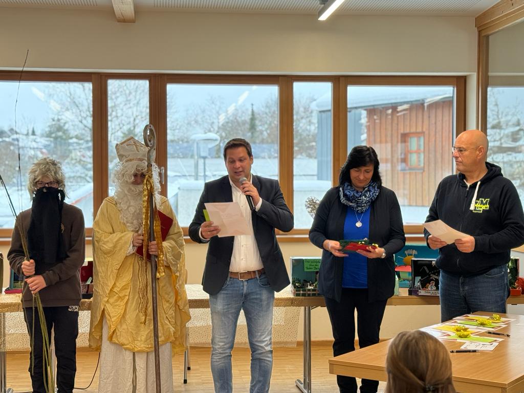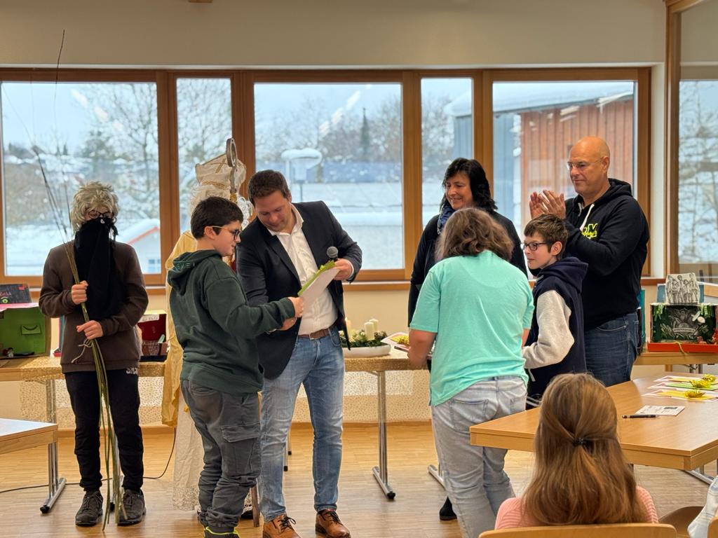Heute stand - mit einem Tag Verspätung, da gestern der Unterricht witterungsbedingt ausfiel - der Vorlesewettbewerb auf dem Stundenplan unserer Schülerinnen und Schüler der 6. Klassen. Ein wenig nervös waren sie schon unsere 6 VorleserInnen, die bereits in den 3 jeweiligen Klassen ihr Bestes gegeben und sich in einem klasseneigenen Vorentscheid für den heutigen Wettbewerb qualifiziert hatten. Klassenleiter Andrea Schmalhofer und Patrick Pfisterer, die den Tag hervorragend vorbereitet hatten, führten gekonnt und kurzweilig durchs Programm. Leonardo Varadi, Nikolina Kocubij, Eda Sejfulahi, Leonie Balk, Zoe Mitterer und Philip Ecker sowie Rositsa Asenova konnten alle durch ihre Leistungen überzeugen. Somit war es für die Jury, bestehend aus dem 2. Vorsitzenden des Fördervereins und Bürgermeister Thomas Lorenz, Alexandra Plechinger von der Sparkasse, Förderlehrerin Carina Ammerseder, Vorjahressiegerin Luisa Herman und Rektor Ehrenreich, alles andere als leicht, die Plätze zu vergeben. Am Ende setzte sich Leonie Balk durch. Herzlichen Glückwunsch an alle Protagonisten, die sich allesamt über Geschenke des EB und der Sparkasse freuen konnten. Auch der Hl. Nikolaus, der zufällig vorbeikam, lobte die Leistungen der Vorleser ausdrücklich. Da macht Leserziehung Spaß!