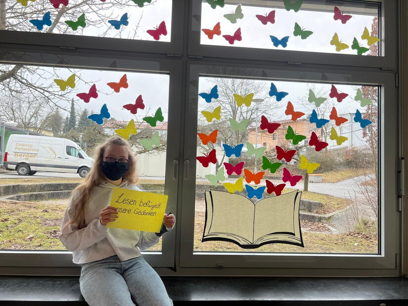 Ein Fensterbild, das nicht nur gute Laune macht, sondern auch unsere Gedanken beflügelt - unter diesem Motto haben sich die Schülerinnen und Schüler der Klasse 6b um ihre Klassenzimmerfenster gekümmert und Schmetterlinge gebastelt. Gemeinsam haben sie dieses Motiv ausgesucht. Dabei merkten die Schülerinnen und Schüler schnell, dass noch mehr hinter diesem bloßen Bild steckt. Im Deutschunterricht fanden sie Interpretationen dafür, wie „Lesen beflügelt unsere Gedanken“ oder „Bücher erwecken meine Fantasie“.