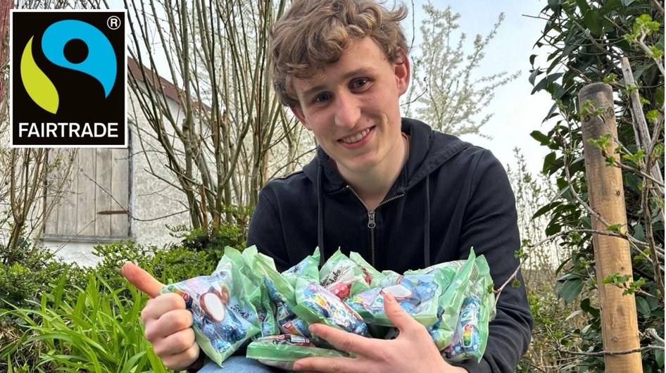 Lennox Lehner, Landkreisschülersprecher und unser einziger derzeit nicht in Berlin befindlicher SMV-ler, hatte mit Tobi Hötzinger vom TechnikTeam eine tolle Idee: Am letzten Schultag vor den Osterferien dürfen sich unsere Kinder und Jugendlichen über 350 Schokoladeneier freuen. Die süßen vorösterlichen Überraschungen werden kurz vor der zweiten Pause im Bereich des kleinen Pausenhofes versteckt … und mit Sicherheit auch gefunden und vernascht. Logisch, dass wir als Fairtradeschool hier fair gehandelte Produkte gewählt haben. Danke für die Spende, Familie Lehner!