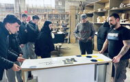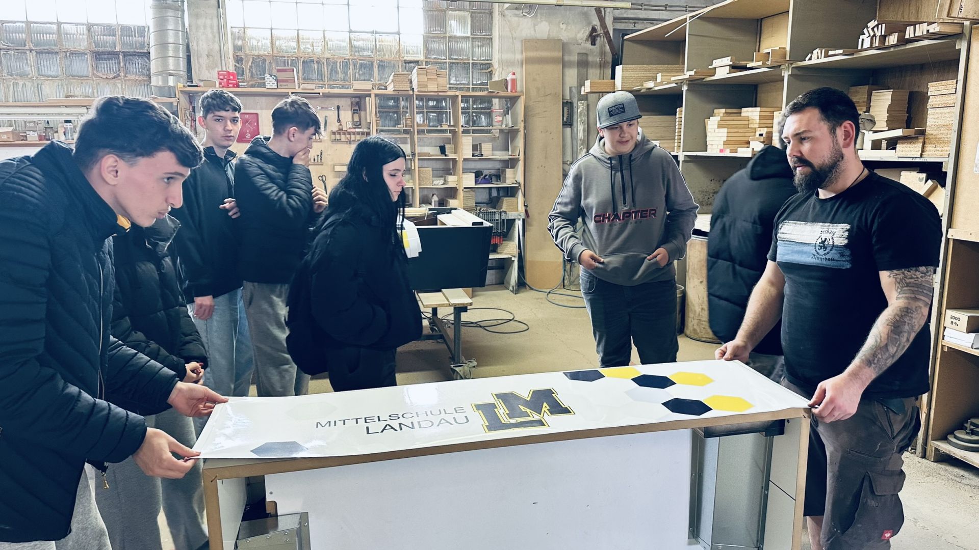 Das gab´s wohl noch nie: die Technikgruppe 8ab besuchte gleich zwei Betriebe an einem Nachmittag. Und das hatte auch seinen ganz besonderen Designhintergrund, denn der Globalplayer und einer der big5 im Bereich der Sporttischkicker („Spielzeug machen wir hier nicht!“) „Leonhart“ aus Harburg sponserte der MSL einen nigelnagelneuen LEO - Turnierkicker, auf dem ansonsten die Profis auf diversen Meisterschaften zaubern. Die angehenden Techniker konnten beim Hersteller vor Ort den gesamten Produktionsweg eines Tischkickers miterleben, wurden dabei von den Brüdern Christian und Andreas Fiedler durch die Werkstätten und Produktionshallen geleitet. Sie wussten sehr viel über die einzelnen Schritte, die Berufe und eingesetzten Maschinen zu erzählen, zogen die Jugendlichen in ihren Bann. Das Highlight aber war sicherlich, als die Schüler den Tisch eigenhändig - selbstverständlich mit professioneller Unterstützung - mit der von der Firma TYPO an der ersten Station des Tages vor den Augen der Kinder gedruckten Folie bekleben durften.