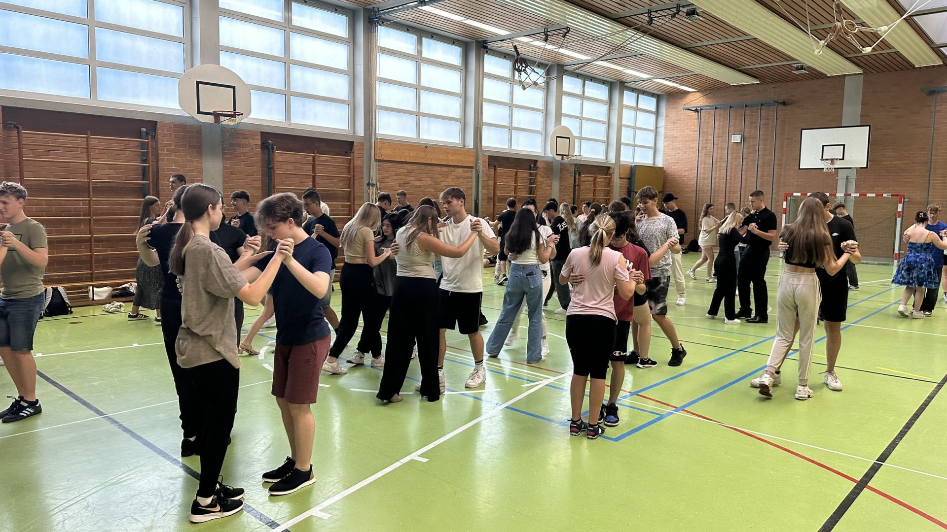 4 Tage lang ist für unsere fünf 9. Klassen Tanzkurs angesagt. Schon etwas aufgeregt sind demnach seit diesen Montag etwa 100 Jugendliche am Werken, um gemeinsam die wichtigsten Standardtänze zu erlernen. Maxim Kube, der Tanzlehrer, hat da schon eine große Aufgabe … wir sind aber sehr zuversichtlich, dass er allen für den Abschlussball am Donnerstag die wichtigsten Schritte dieser „wichtigen“ Kulturtechnik näherbringen wird. Bisher sieht´s gut aus!