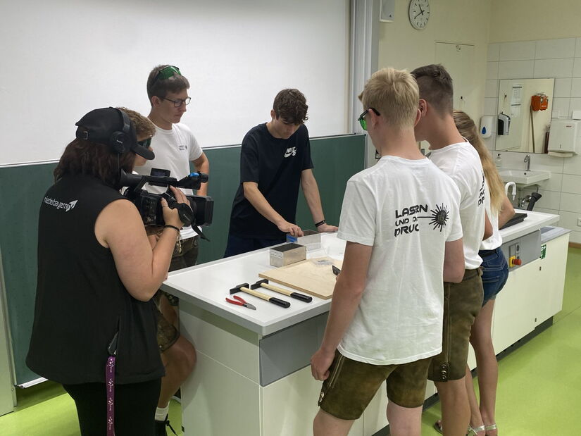 Unsere Schülerfirma „Lasern und da Druck“ stößt auf großes Medieninteresse. Gestern besuchte uns NiederbayernTV aus Deggendorf, um einen Beitrag über die Produktion der Echtholzbuttons für das Maschal - Festzelt auf dem Landauer Volksfest aufzunehmen. Selbstverständlich wurde auch die Übergabe der Buttons an die beiden Festwirte filmisch festgehalten. Wir freuen uns schon auf den Beitrag, der heute Abend ausgestrahlt werden wird.