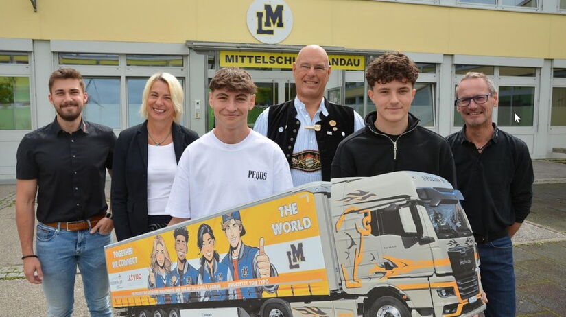 Unlängst durften wir uns sehr darüber freuen, als der durch uns gestaltete LKW in „GROSS“ bei uns an der Schule vorgestellt wurde. Seit einigen Wochen ist er nun im Nahverkehr für die Spedition Niedermaier unterwegs und erste Rückmeldungen belegen: Er fällt nicht nur (positiv) auf, sondern erfüllt auch seinen Zweck: Durch die Werbung fühlten sich offenbar schon eine ganze Reihe von Jugendlichen so angesprochen, dass sie sich für einen der vielen möglichen Ausbildungsberufe beworben haben. Damit dieses tolle Projekt auch nachhaltig auch bei uns an der Schule präsent ist, hat uns gestern Andreas Schaffer von TYPO einen imposanten LKW auf Alu-Trägerplatte gemeinsam mit Speditionschefin Birgit Ach und Projektmanager Dominik Seidel vorbei gebracht. Freut uns! Danke!!