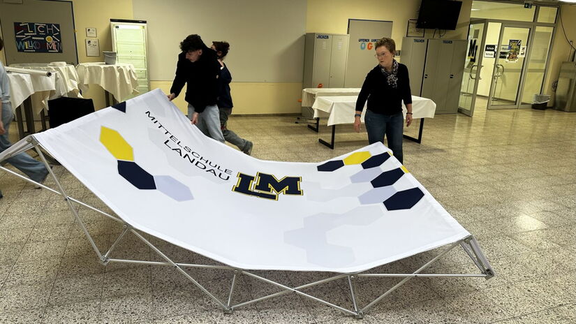 Heute ist Startschuss für unsere neue, 7. Schülerfirma: Die LemonSplash Vertriebs AG. Und diese wird sich hochprofessionell präsentieren, denn für die Jugendlichen aus der 8b GTK haben wir von der Firma TYPO, mit der wir auch in anderen Projekten zusammenarbeiten, einen Messestand/ein Faltdisplay erhalten. Logisch, dass da die Geschäftsleute super gespannt waren, wie das Teil denn so ausschaut und es sofort zusammensteckten! Tolle Sache!!!
