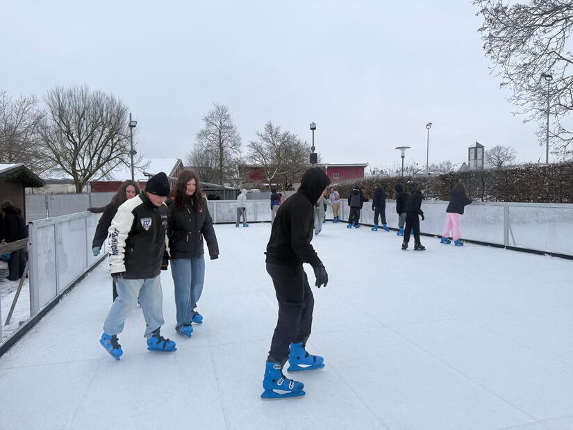 Auf dem Gelände des Freibads herrscht derzeit reger Betrieb: Zahlreiche Sportgruppen und Schulklassen nutzen begeistert die Kunsteisbahn. Die Freude ist allgegenwärtig: Mit strahlenden Augen und viel Gelächter ziehen die Kinder und Jugendlichen ihre Kreise über das Eis.Für viele von ihnen ist es der erste Kontakt mit Schlittschuhen. Da sind wackelige Schritte und der ein oder andere Sturz kaum zu vermeiden. Doch gerade diese kleinen Unsicherheiten sorgen für besondere Erlebnisse: Mit Unterstützung von Freundinnen und Freunden schaffen es am Ende alle, einige Runden „unfallfrei“ zu meistern. Gemeinsames Üben, gegenseitiges Anfeuern und helfende Hände beim Wiederaufstehen schaffen eine Atmosphäre voller Teamgeist und guter Laune.