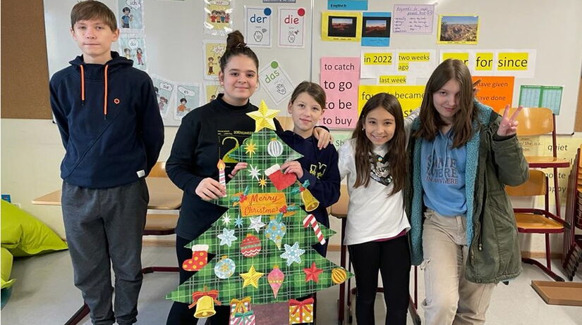 Erst vor wenigen Tagen mussten wir aus Kapazitätsgründen unsere Deutschklasse mit einem DK2 – Förderkurs erweitern. Da gilt es natürlich zunächst einmal, sich in der neuen „Klasse“ auch gegenseitig kennen zu lernen. Da war es eine super Idee, gemeinsam etwas zu basteln … was liegt da in der aktuellen vorweihnachtlichen Zeit näher als miteinander und unter der Anleitung von Fiedler einen Weihnachtsbaum zu gestalten? Nebenbei konnte man auch gleich einige wichtige neue Wörter lernen … Schere, Kleber, Papier, Stern und Pappe etc.