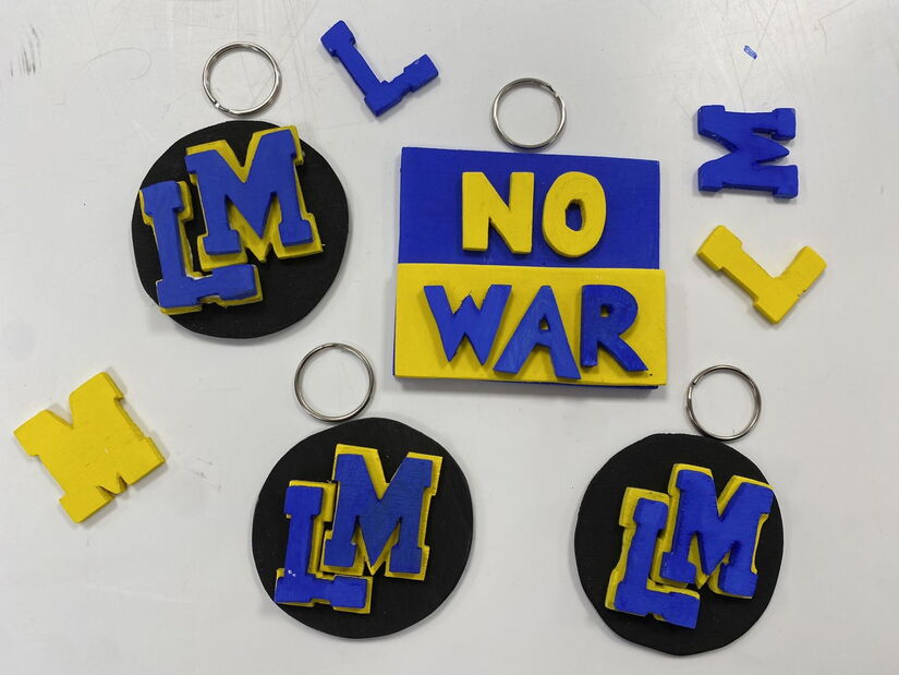 Sehenswerte Schlüsselanhänger stellen gerade die Jungs und Mädels der Technikgruppe 7 von Herrn Ehrenreich her. Gar nicht so einfach war es, so genau mit der Laubsäge zu hantieren, dass die feinen Umrisse der Buchstaben unseres Schullogos oder des Schriftzuges „NO WAR“ auf dem Hintergrund der Ukrainischen Flagge auch gut ausschauen. Gut, dass wir schon fleißig geübt haben. Einige sind sogar schon fertig!
