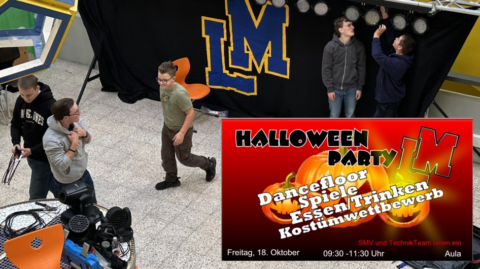 Am Freitag wird bei uns in der Aula wieder der Bär steppen! Die große Halloweenparty der SMV und des TechnikTeams steht auf dem Stundenplan. Die Vorfreude unter allen Schülern ist groß, doch so eine coole Party erfordert viel Vorbereitung. Gerade baut unser Technikteam die Bühne auf, die Jungs haben sich ein besonderes Setup überlegt: Truss, Molton, Scanner, Weißlicht, Movingheads, 3 EV Evolve, 2 digitales Mischpult Sound, Lichtmischpult u.v.m. werden aufgebaut, verkabelt, angeschlossen und programmiert. Die Umfrage zur Playlist wird toll angenommen, die SMV plant Spiele und Einlagen...: Wir alle freuen uns schon!