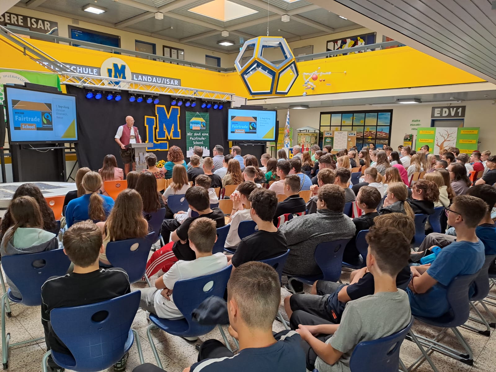 Heute war es so weit: Die MS Landau wurde als Fairtrade Schule geehrt. In einer feierlichen Stunde durften wir neben Carina Blischke, Referentin Fairtrade Deutschland auch Bürgermeister Matthias Kohlmayer, Stadtrat Daniel Lang, Fördervereinsvorsitzenden Josef Schätz, Alexandra Perstorfer vom Elternbeirat, Frau Lehner und Frau Sancak als beteiligte Eltern der AG, Frau Hummel vom Eine Welt Laden Landau, alle Klassen der Jahrgangsstufen 7 und 8 mit deren Lehrkräften, vor allem aber die M7c mit Klassenleiterin Yaprak Simsek, die sich ganz besonders im Verlauf des Projektes eingesetzt haben und auch die heutige Auszeichnungsfeier maßgelblich gestalten, begrüßen.