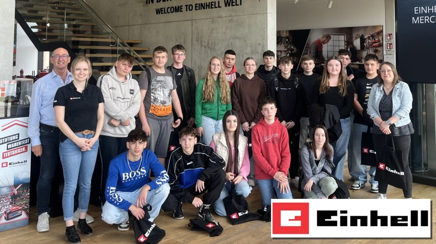 Nach einer Begrüßung durch Fabienne Karl, die den interessierten Jugendlichen auch einen kurzen Überblick über die Geschichte, den Betrieb, die Produkte und die Produktentwicklung der Firma Einhell gab, ging´s gleich auf das Werksgelände. Bei der beeindruckenden Führung durch den Betriebsrat Maximilian Fritz konnte man sich einen Eindruck über den Entwicklungsbereich, die Lagerhallen, den Anlieferungsbereich, das moderne und riesige Hochregallager, die Retourenannahme, den Reparaturbereich für defekte Geräte, das Ersatzteillager und den Servicebereich (Kundenbetreuung) machen. Abschließend staunten die SchülerInnen der Vorabgangsklassen im Showroom über die umfangreiche Produktpalette des weltweit agierenden Landauer Konzerns. „Toll, das ist wirklich super!“, äußerte sich da einer der Schüler, der spontan so richtig Lust auf eine Ausbildung bei Einhell bekam. Mit einer Information über eine ganze Reihe möglicher Ausbildungsberufe und auch Ferienjobs durch Fabienne Karl sowie einem gemeinsamen Abschlussfoto endete der spannende und lehrreiche Nachmittag.