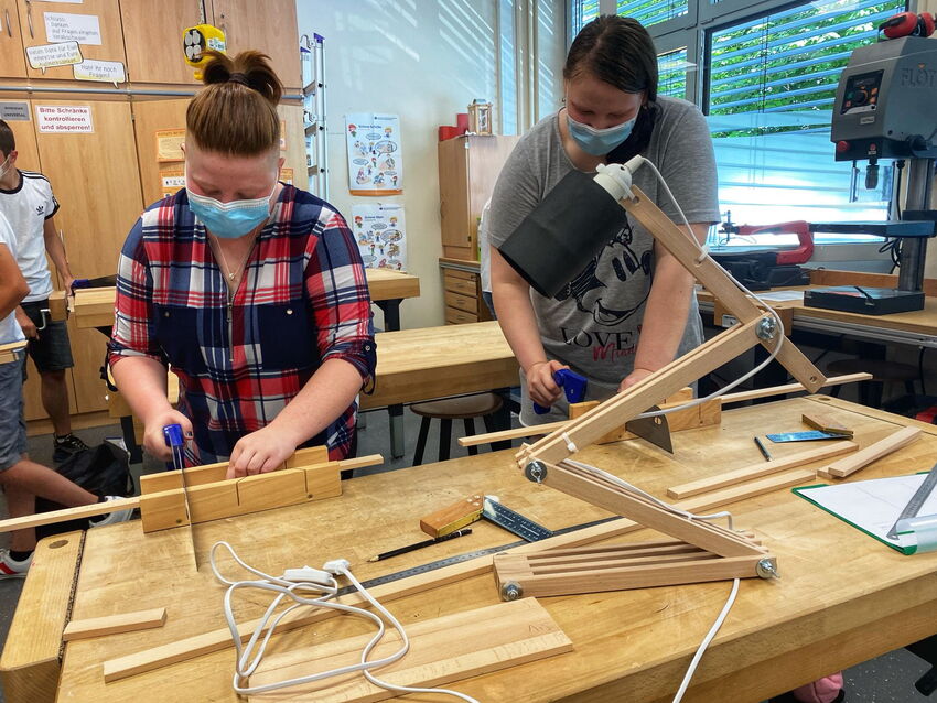 Dann aber kam die Pandemie und die Schulschließung und unser Technikunterricht bestand aus viel zu viel Zeichen, TZ und Theorie. Umso mehr freut es die Technikgruppe 8 von Herrn Ehrenreich, dass jetzt endlich wieder praktisch gearbeitet werden kann: Sägen, bohren, schleifen, schrauben - das macht Spaß!
