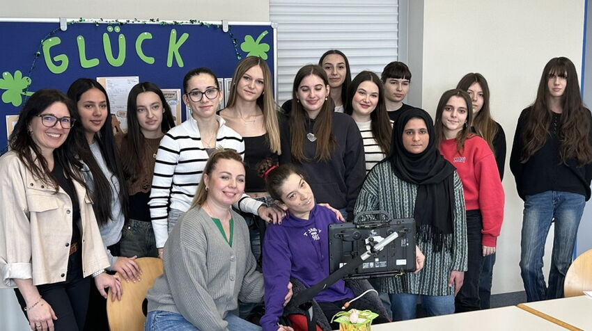 Heute durfte sich die Gruppe „Ernährung und Soziales 9“ von Silvia März über einen ganz besonderen Besuch freuen: Jana, eine mehrfach behinderte junge Frau, die in den Rollstuhl gefesselt ist und sich über einen Sprachcomputer verständigt, besuchte mit ihrer Mutter und der Betreuerin die MS Landau. Zum Thema „Was ist Glück?“, das die Schüler schon in den letzten Stunden in den Fächern Ethik, Religion, Deutsch und Soziales behandelt hatten, wusste Jana mit Unterstützung ihrer Mama viel zu erzählen: „Glück ist Essen und Trinken zu können. Glück ist sich unterhalten zu können. Glück ist, eine umsorgende Betreuerin zu haben. … “ führte Frau Kanzoulas aus und stimmte damit sicherlich den einen oder anderen ein wenig nachdenklich. Denn man war sich sehr wohl bewusst, dass vielfach Geld, Markenklamotten oder ein teures Handy - kurz viel Materielles – hier lange Zeit in den Vordergrund gerückt wurden. Doch es gibt auch auf jeden Fall ganz große Übereinstimmungen; so ist es für jeden wichtig, Familie zu haben. Und noch eines hat die Gruppe von Jana lernen dürfen: Auch Menschen mit schweren körperlichen Behinderungen sind glücklich, wollen was erleben und andere Menschen kennen lernen. Denn bei „Glück ist, mit Freunden etwas erleben“ waren sich auf jeden Fall alle einig. Demnach: Definitiv eine Win-Win- Situation, von der alle Beteiligten profitieren durften. Danke für deinen Besuch, Jana!