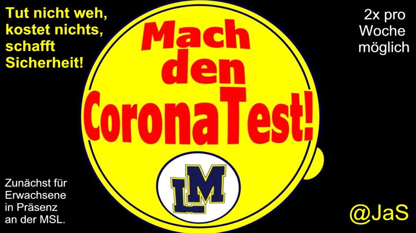 Aktuell können sich zunächst Erwachsene, die an der MSL beschäftigt sind, 2x pro Woche mit einem Antigen-Schnelltest kostenlos selbst testen. "Tut nicht weh, kostet nichts, schafft Sicherheit! WARUM EIGENTLICH NICHT!!?!?" lautet da unsere Devise. Für Reihentestungen an Schulen, die dann auch für Schüler umgesetzt werden, werden gerade durch das KM die Zahlen festgestellt. Sicherlich werden hier auch in Kürze weitere Kapazitäten geschaffen ...